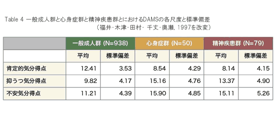 以上のことから、DAMSは高い臨床的妥当性を有していることが示されている。以上の結果の他、各疾患別の分析などについては福井・木津・田村・千丈・奥瀬(1997)か福井(2002)を参照されたい。